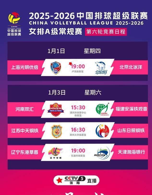 足球直播,欧洲杯直播,体育直播,球客直播,雷速体育,篮球直播,风驰直播,NBA直播,英超直播,足球比分,足球赛事,意甲,欧冠,世界杯,世界杯直播,村超,贵州村超,波胆,角球,串球,大小球2026年1月1日晚上7点,上海市卢湾体育馆将迎来一场排超联赛的焦点战役。 上海光明优倍女排坐镇主场,迎战北京北冰洋女排。 这场京沪对决被安排在元旦晚上进行,CCTV5将现场直播这场备受瞩目的比赛。