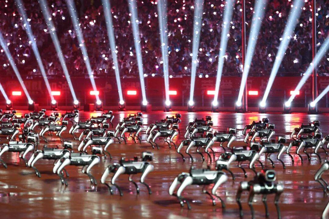 科技展示更是“苏大强”的舒适区。炫酷的“苏超F1”卡丁车,是常州本土企业九号公司旗下纳恩博(常州)科技有限公司生产的赛格威卡丁车Pro2,以超跑工程逻辑打造,让普通人也能体验赛道乐趣;齐舞的机器人由魔法原子机器人科技有限公司研发,公司在苏州、无锡、常州均有布局,近300台机器人、机器狗通过统一指令进行群控表演,打破“机器人数量最多、规模最大、群控技术最难”的纪录……