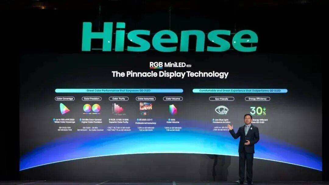 据海信官方介绍,RGB-Mini LED技术基于全新的玲珑全光谱控制架构,有效解决串色、色晕问题,精准还原球衣颜色、草坪色泽,无限趋近于人类肉眼所见的真实色彩,帮助裁判区分球员动作边界。