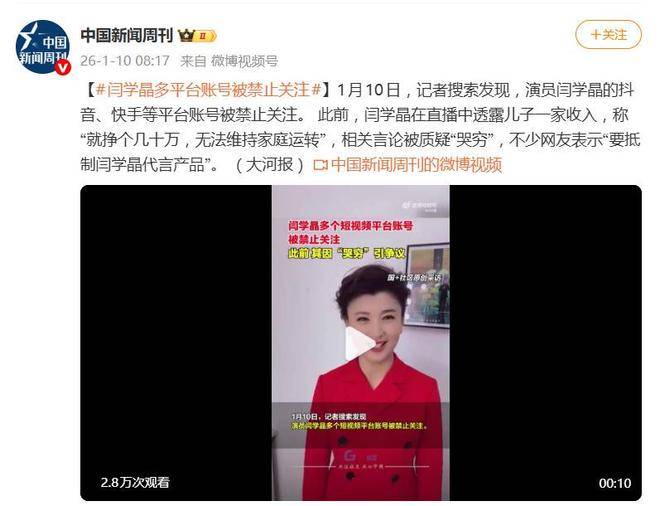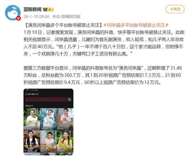 足球直播,欧洲杯直播,体育直播,球客直播,雷速体育,篮球直播,风驰直播,NBA直播,英超直播,足球比分,足球赛事,意甲,欧冠,世界杯,世界杯直播,村超,贵州村超,波胆,角球,串球,大小球一句年入几十万不够花让演员闫学晶陷入了舆论风波,甚至导致她的短视频账号被平台禁关。1月10日,媒体报道称,闫学晶的抖音和快手账号都被限制关注,这起源自直播中的言论,已经从网络争议逐渐升级为对她商业价值与公众形象的严重危机。