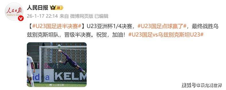 中国队挺进U23亚洲杯四强,继续刷新中国U23队史,全队都是好样的,特别是门将李昊太神了。人民日报撰文鼓励:“U23亚洲杯1/4决赛,U23国足最终战胜乌兹别克斯坦队,晋级半决赛。祝贺,加油!”对于这支精神属性拉满的中国U23,中国球迷非常满意,在成绩上已没有过多苛求。