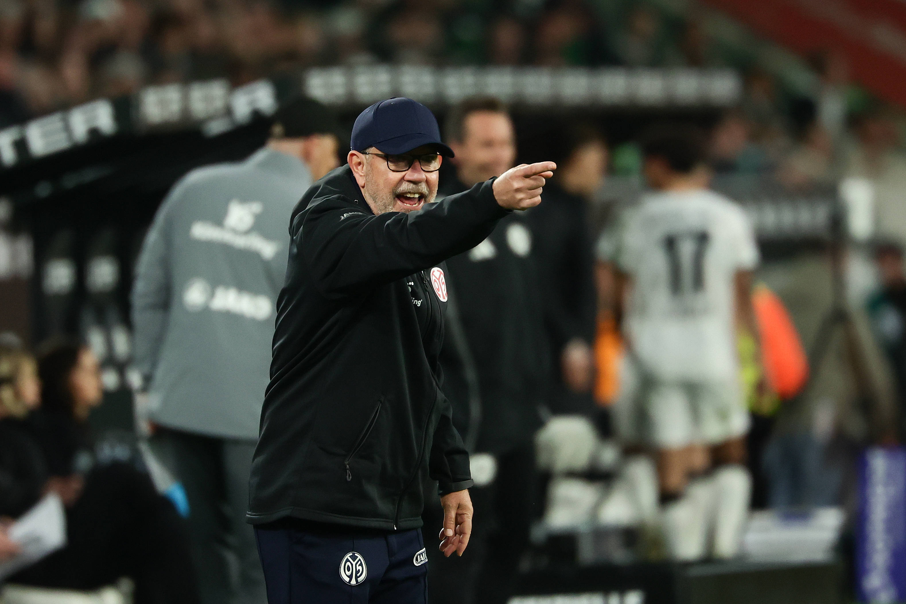 4月19日,美因茨队主教练菲舍尔在场边指挥。 新华社发(约阿希姆·毕瓦勒兹摄)
