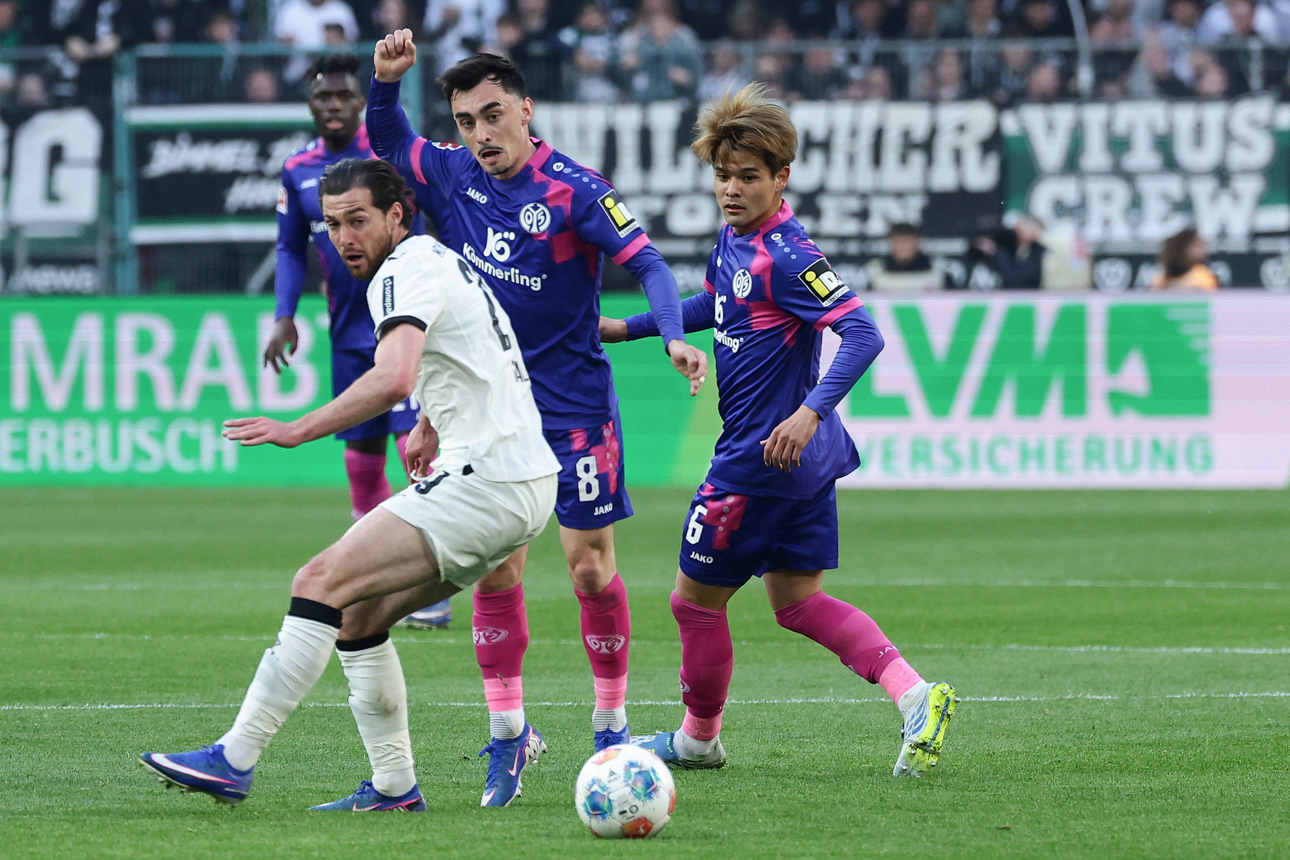 4月19日,门兴格拉德巴赫队球员斯卡利(左)和美因茨队球员内贝尔(中)在比赛中拼抢。 新华社发(约阿希姆·毕瓦勒兹摄)
